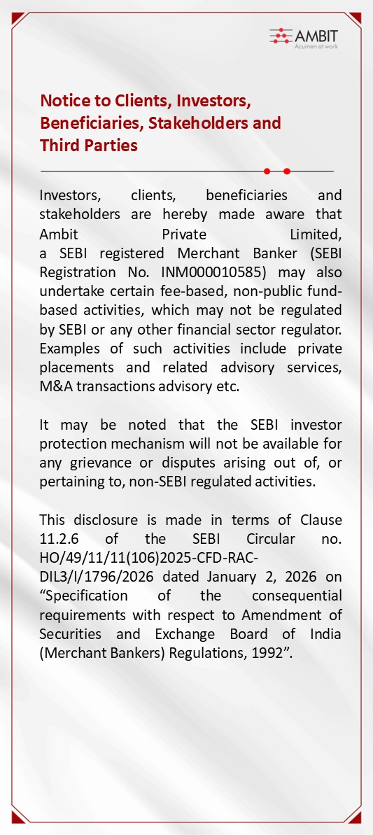 Ambit Capital Private Limited is registered as a Stock Broker with BSE Ltd. (Membership Number 3081) and National Stock Exchange of India Limited (NSE) (Membership Number 12476), as a Depository Participant of Central Depository Services Ltd. (CDSL) (Depository Participant No - 12047500) and as a Research Analyst registered with SEBI (Regn. No. INH000000313) and as a Member with BSE (BSE Enlistment No. 5020)