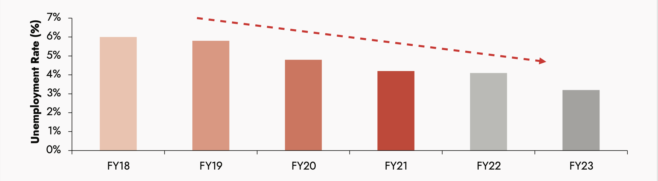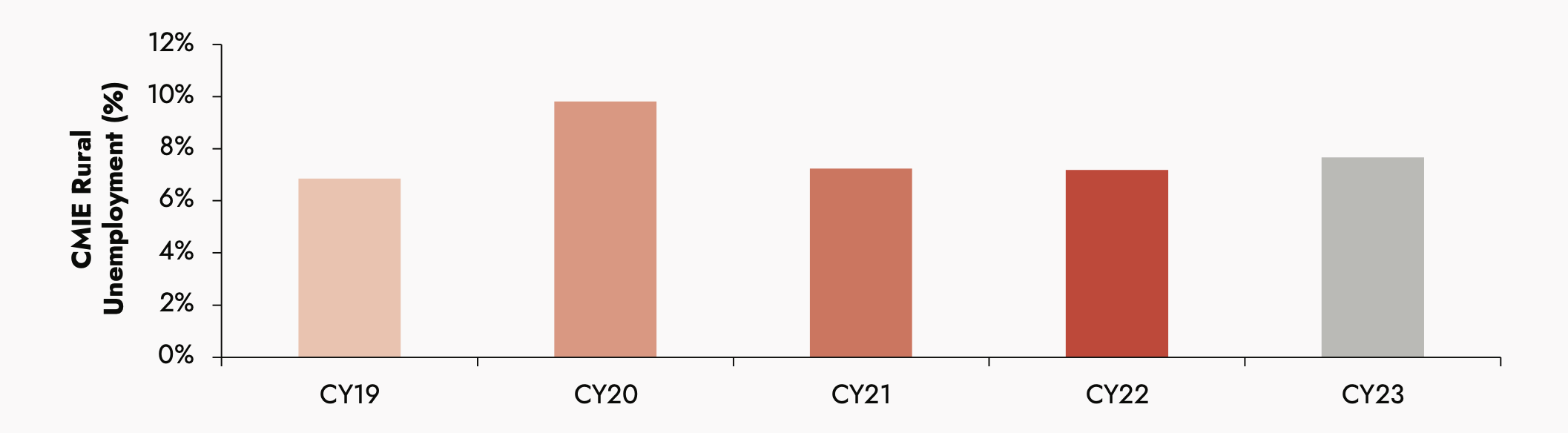 While the overall unemployment rate of India has dropped below pre-Covid levels on a pan-India basis, specifically, in rural regions, the unemployment rates have not worsened as compared to pre-COVID levels according to CMIE rural unemployment data. The Labour Force Participation Rate, which indicates the percentage of the working-age population either employed or actively seeking employment, has increased from 50.7% in FY18 to 60.8% in FY23 for rural regions. Worker Population Ratio, representing the percentage of employed individuals in the population, has also increased in rural India rising to 59.4% in FY23 from 48.1% in FY18.