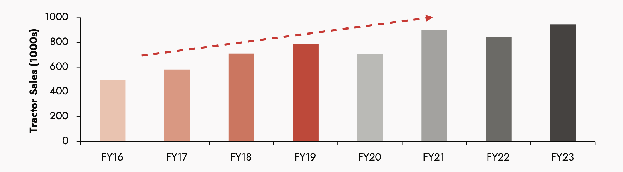 - 2-wheeler sales experienced decline at a CAGR of -3.1% until FY23 over FY20; in FY24TD they have recovered by 10% on a YoY basis but is still below pre-COVID levels.
