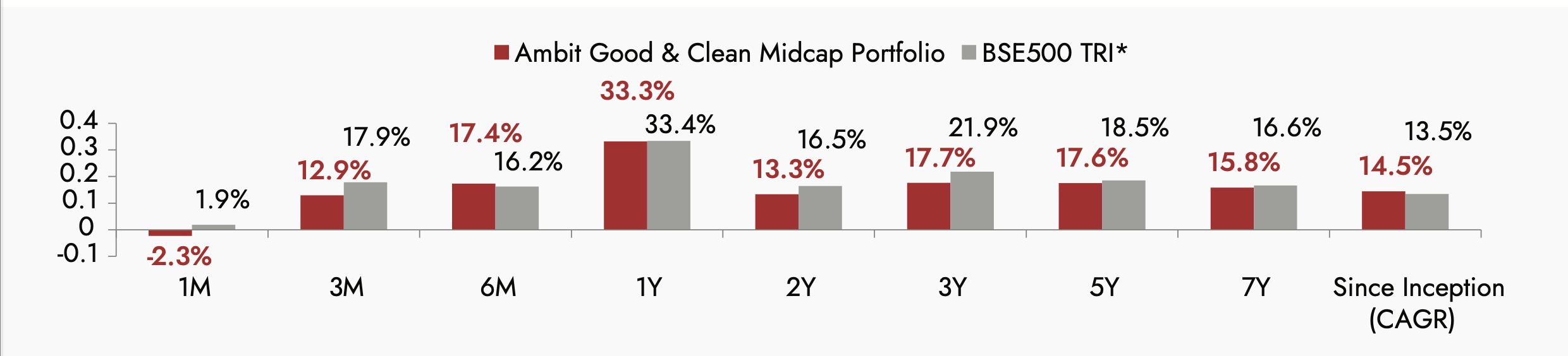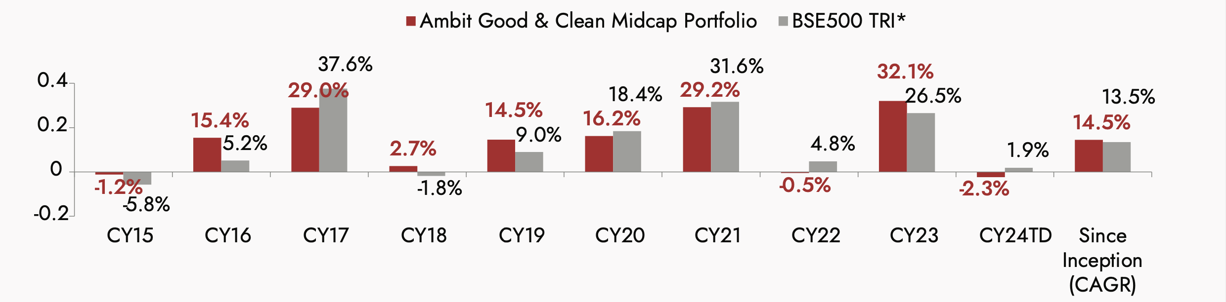 Source: Ambit; Portfolio inception date is March 12, 2015; Returns as of January 31st 2024; All returns above 1 year are annualized. Returns are net of all fees and expenses. *BSE 500 TRI is the selected benchmark for the Ambit Good & Clean Midcap strategy and the same is reported to SEBI.
