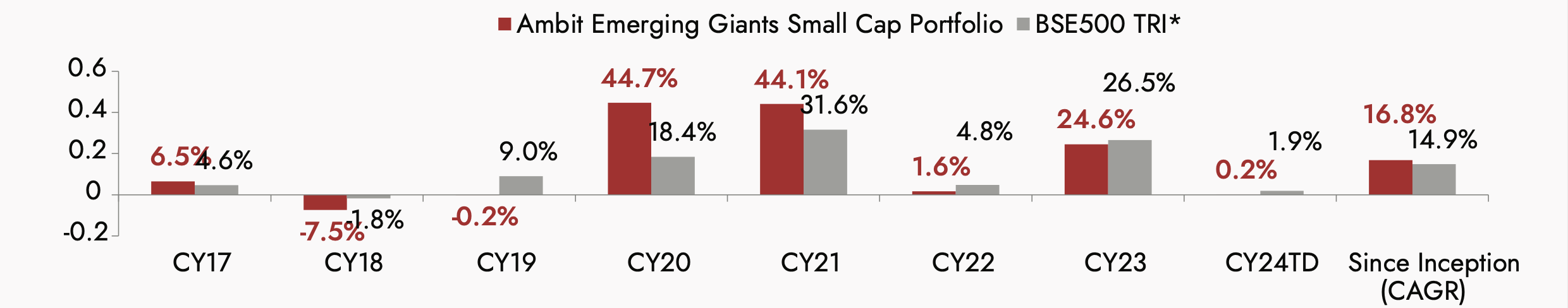 Source: Ambit; Portfolio inception date is December 1, 2017; Returns as of January 31st 2024; All returns above 1 year are annualized. Returns are net of all fees and expenses. *BSE 500 TRI is the selected benchmark for the Ambit Emerging Giants strategy and the same is reported to SEBI.