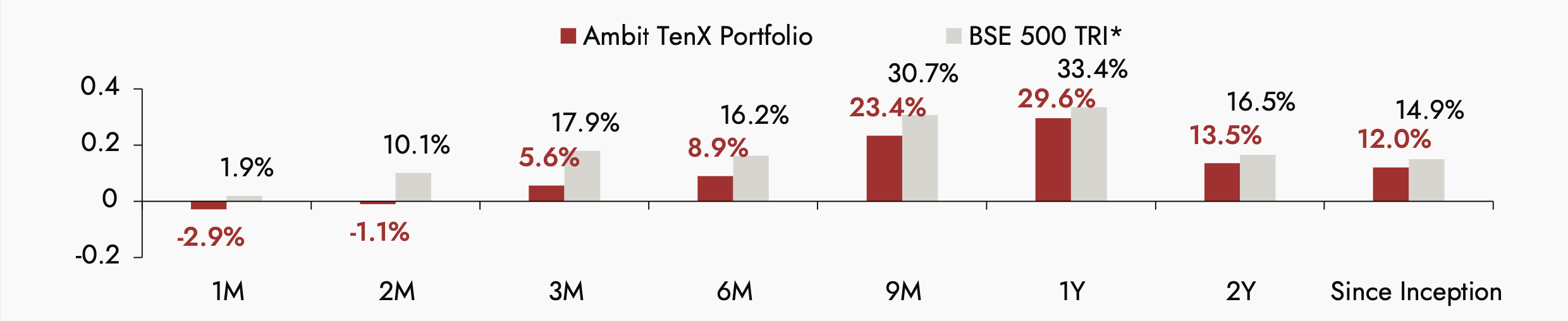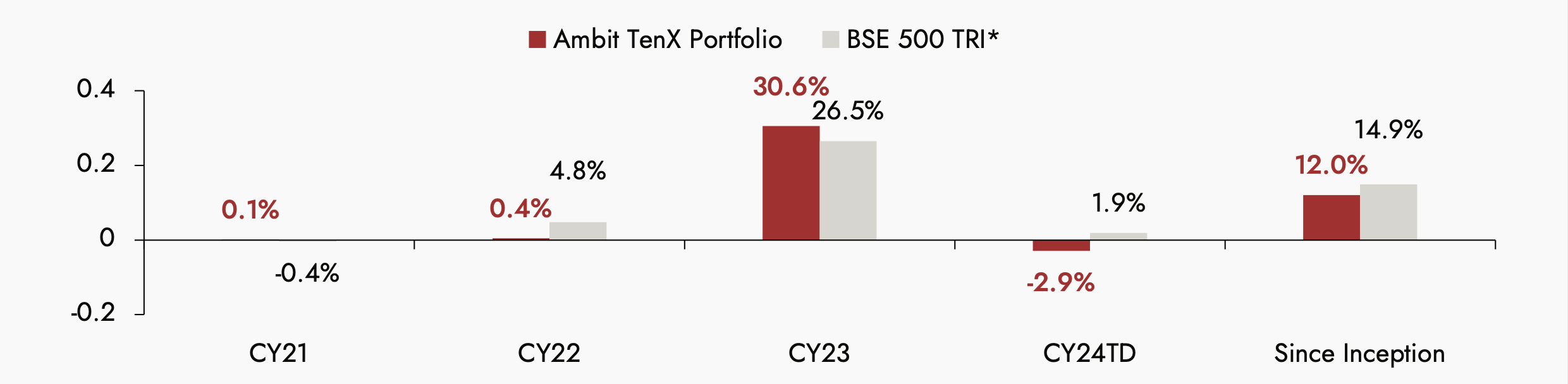 Source: Ambit; Portfolio inception date is December 13, 2021; Returns as of January 31st 2024. Returns are net of all fees and expenses *BSE 500 TRI is the selected benchmark for the Ambit TenX Portfolio and the same is reported to SEBI.