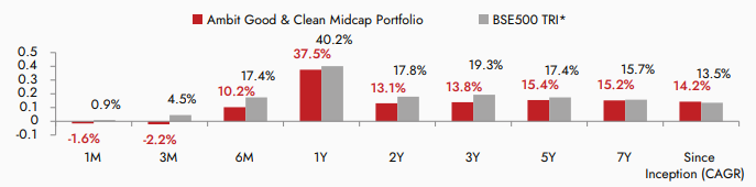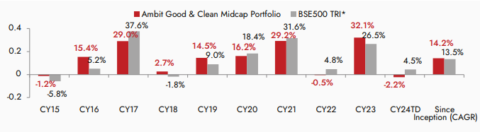 Source: Ambit; Portfolio inception date is March 12, 2015; Returns as of March 31st 2024; All returns above 1 year are annualized. Returns are net of all fees and expenses. *BSE 500 TRI is the selected benchmark for the Ambit Good & Clean Midcap Portfolio and the same is reported to SEBI.