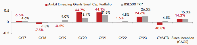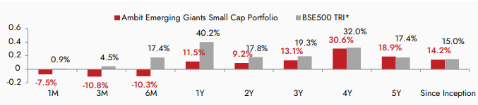 Source: Ambit; Portfolio inception date is December 1, 2017; Returns as of March 31st 2024. Returns are net of all fees and expenses. *BSE 500 TRI is the selected benchmark for the Ambit Emerging Giants Small Cap Portfolio and the same is reported to SEBI.