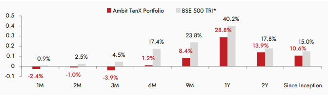 Source: Ambit; Portfolio inception date is December 13, 2021; Returns as of March 31st 2024; Returns are net of all fees and expenses *BSE 500 TRI is the selected benchmark for the Ambit TenX Portfolio and the same is reported to SEBI.
