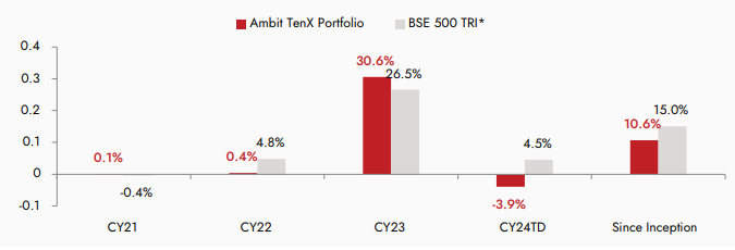 Source: Ambit; Portfolio inception date is December 13, 2021; Returns as of March 31st 2024. Returns are net of all fees and expenses *BSE 500 TRI is the selected benchmark for the Ambit TenX Portfolio and the same is reported to SEBI.