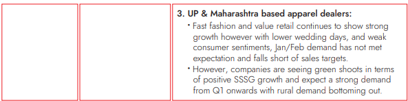 - Luggage and apparel demand has moderated due to seasonally weak quarter due to lower marriages.