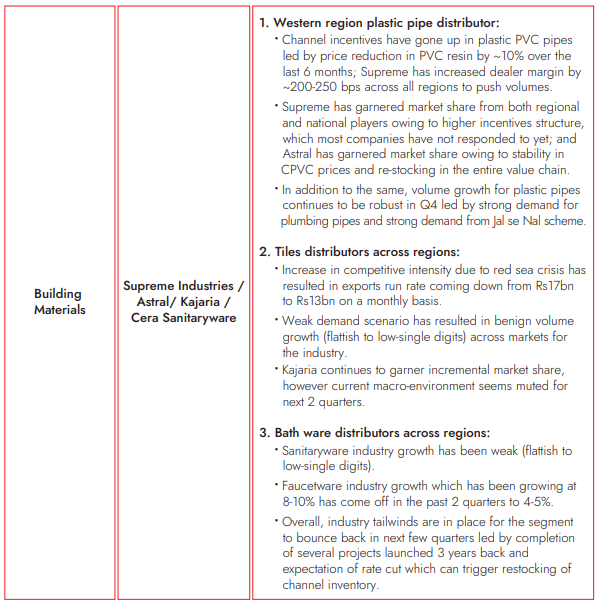 - Persisting weakness in the building material segment led by channel sitting on low inventory due to elevated interest rates and developers focusing on project construction; building material demand comes when the building structure is completed and flats are being prepared for giving possession.