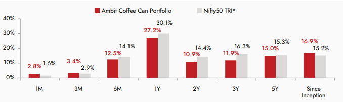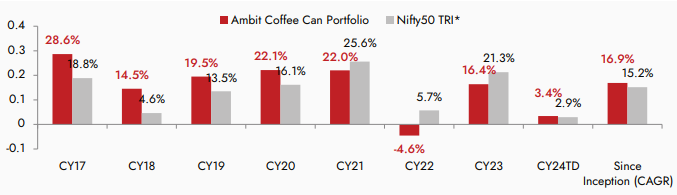 Source: Ambit; Portfolio inception date is March 6, 2017; Returns as of March 31st 2024; All returns are post fees and expenses; Returns above 1 year are annualized; Note: Returns prior to Apr’19 are returns of all the Pool accounts excluding non-aligned portfolio, and returns post Apr’19 is based on TWRR returns of all the pool accounts. *Nifty 50 TRI is the selected benchmark for the Ambit Coffee Can Portfolio and the same is reported to SEBI.