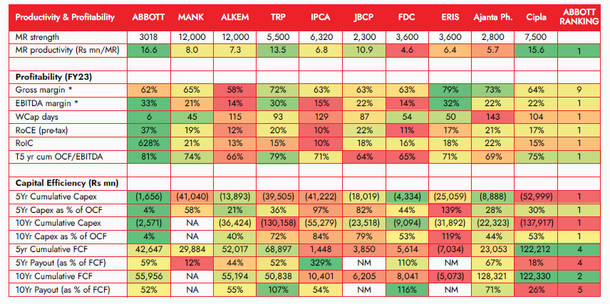 Most of its domestic and MNC peers face issues such as high capex intensity, high R&D spending, dependence on inorganic initiatives for growth, low return ratios, stagnant core growth, margin volatility, high working capital, high regulatory risks and governance issues. Abbott has none of these issues. Over FY14-23, Abbott generated INR47.7b OCF, undertook capex of only INR5b, generated FCF of INR42b and paid out INR29.5b in dividends.