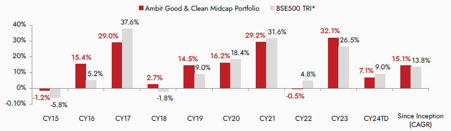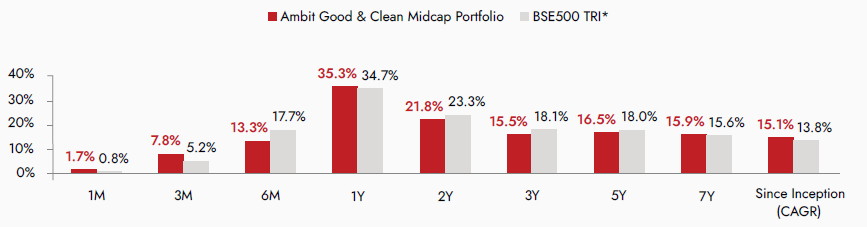 Source: ##Ambit Good & Clean Mid cap Portfolio inception date is Mar 12, 2015. #Returns are net of all fees and expenses; Returns above 1yr are annualized