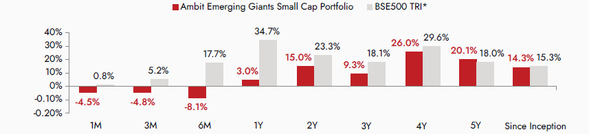 Source: ##Ambit Emerging Giants Small cap Portfolio inception date is Dec 1, 2017. #Returns are net of all fees and expenses; Returns above 1yr annualized