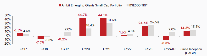 *BSE 500 TRI is the selected benchmark for the Ambit Emerging Giants Small Cap Portfolio and the same is reported to SEBI.