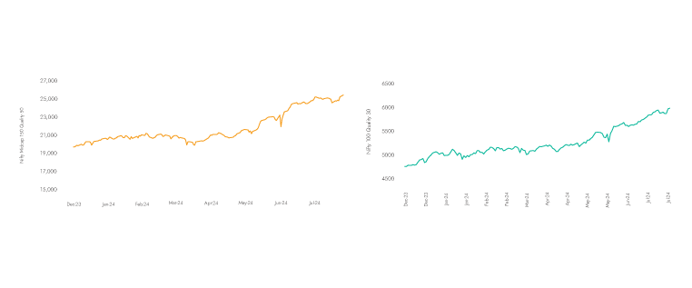 Since the election poll results were announced on 3rd June, quality indices have experienced a notable rebound in performance. Prior to the elections, these indices had shown relatively lacklustre results, overshadowed by a broad-based market rally. However, since the election outcome, indices such as the Nifty 100 Quality 30 and Nifty Midcap 150 Quality 50 have risen by 10.0% and 9.6% respectively. In contrast, over the six months# leading up to the elections, these indices had increased by 12.7% and 15.0%.