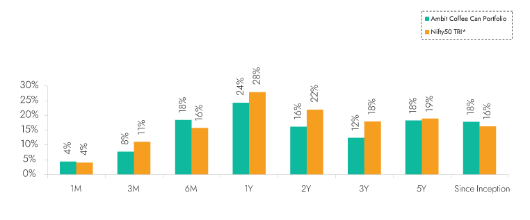 Ambit Coffee Can Portfolio inception date is Mar 06, 2017; *Nifty 50 TRI is the selected benchmark for the Ambit Coffee Can Portfolio. The same is reported to SEBI.