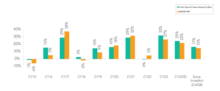 Ambit Good & Clean Mid cap Portfolio inception date is Mar 12, 2015; *BSE 500 50 TRI is the selected benchmark for the Ambit Good & Clean Mid cap. The same is reported to SEBI.
