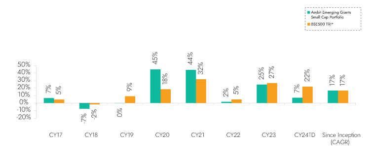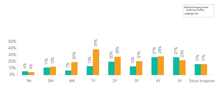 Ambit Emerging Giants Small cap Portfolio inception date is Dec 1, 2017; *BSE 500 TRI is the selected benchmark for the Ambit Emerging Giants Small cap. The same is reported to SEBI.
