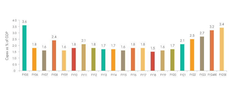Exhibit 2: …translates to a sharply increasing govt capex as % of GDP from 2.1% to 3.4% in FY25BE