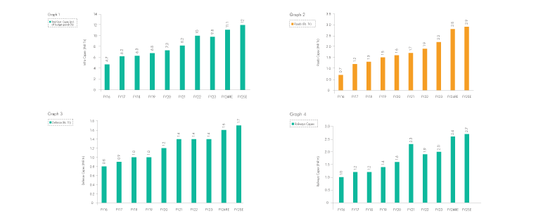 Since the onset of the COVID-19 pandemic, the Indian government has significantly ramped up its capital expenditure. From FY21 onwards, CAPEX spending surged from 4.3 trillion INR to 11.1 trillion INR in FY25BE. In contrast, between FY15 and FY20, CAPEX grew at a more modest pace, rising from 2.0 trillion INR to 3.4 trillion INR by FY20. This sharp increase underscores a strategic shift towards heightened investment in infrastructure and development post-pandemic. As a result, CAPEX as a percentage of GDP went up to 3.4% in FY25BE from 2.1% in FY21.