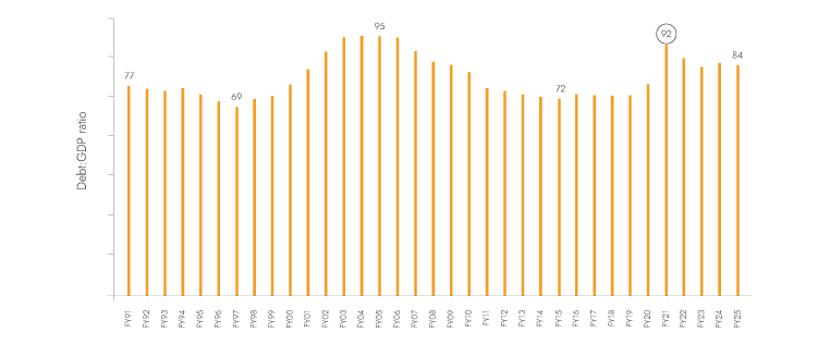 Exhibit 6: India’s debt: GDP ratio currently stands at 84% in FY25