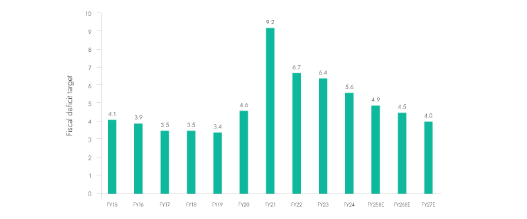 Exhibit 7: India’s fiscal deficit target has reduced from 9.2% in FY21 to 4% in FY27E