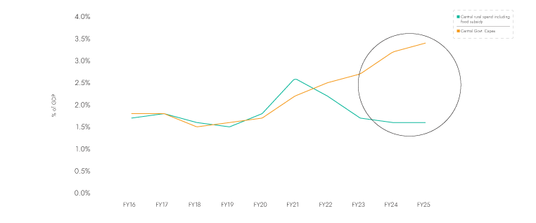 Over the past five years, government spending on rural and agricultural sectors has remained relatively stable at approximately INR 3.9 trillion, while CAPEX has surged from INR 3.6 trillion to INR 8.8 trillion. This shift has created a significant divergence between government CAPEX and rural spending. In FY21, rural expenditure was 400 basis points higher than CAPEX. By FY24, however, CAPEX spending had surpassed rural expenditure by 1600 basis points, highlighting a dramatic realignment in budget priorities.