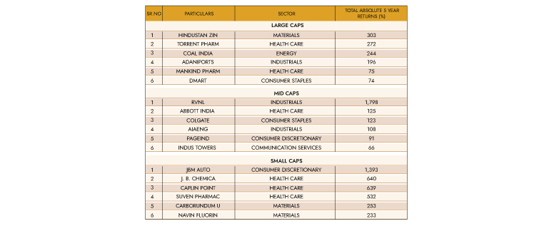- The aggregate results for the Top 50 stocks in the Indian markets, under the Bloomberg Pricing Power methodology, also yield a strong outperformance over FY00-25. The total absolute 5 year returns for FY25LTM, for the list of Top 50 stocks under this methodology is 354%, vs 91% for NIFTY 50 and 115% NSE 500 Index. Except for 11 companies in FY25LTM Top 50 list, all other stocks have outperformed the NSE 50 and NSE 500 Index on 5years absolute total returns.