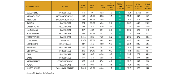 While sorting for Top 50 companies with lowest standard deviation for GPM, few companies with stable but increasing margins also end up getting excluded from the Top 50 list, due to higher standard deviation. While exclusion due to temporary cyclical reasons could be justified, there could be genuine cases where GPM is structurally increasing due to changing product mix, superior competitive positioning etc., which under this methodology gets eliminated. The table below depicts a list of few such companies for FY25LTM, which performance wise on a Total 5 Year returns have done