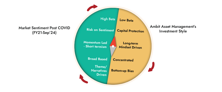 - Process-oriented approach to investing: Typically starting at the largest 500 Indian companies, Ambit's proprietary frameworks for assessing accounting quality and efficacy of capital allocation help narrow down the investible universe to a much smaller subset. This shorter universe is then evaluated on bottom-up fundamentals to create a concentrated portfolio of no more than 20 companies at any time.