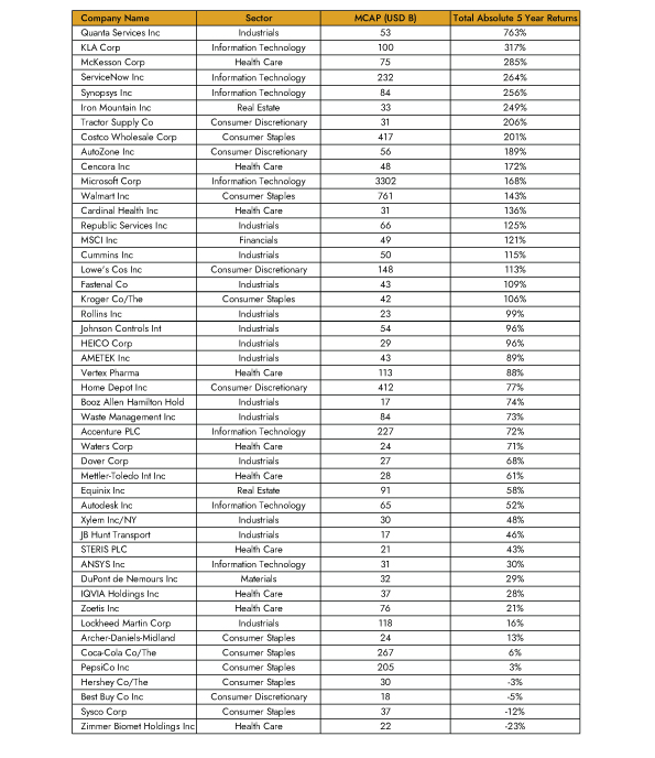 stocks excluded; Average 5 year ROE >10%; *Newly listed stocks Total 5 Year Returns from listing date.