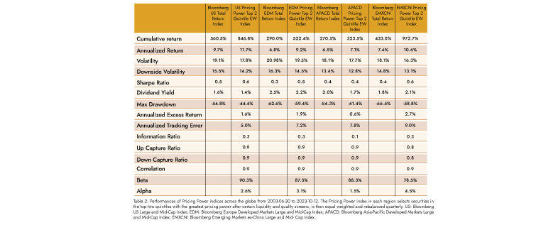 Since pricing power is such a pervasive concept, there are good reasons to expect that it is already “priced in” by the market and does not offer consistent outperformance. However, companies with strong pricing power have historically earned consistently strong returns while maintaining a lower risk profile. Moreover, they have demonstrated similar characteristics across different geographical markets, lending credence to the long-run reliability of pricing power as an investment factor.