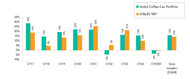 *Nifty 50 TRI is the selected benchmark for the Ambit Coffee Can Portfolio. The same is reported to SEBI.