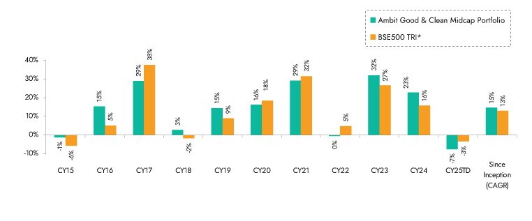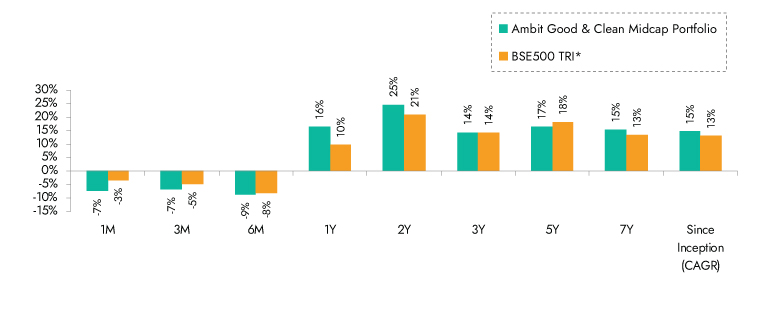 Ambit Good & Clean Mid cap Portfolio inception date is Mar 12, 2015; *BSE 500 50 TRI is the selected benchmark for the Ambit Good & Clean Mid cap. The same is reported to SEBI.