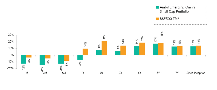Source: Ambit Emerging Giants Small cap Portfolio inception date is Dec 1, 2017; *BSE 500 TRI is the selected benchmark for the Ambit Emerging Giants Small cap. The same is reported to SEBI.