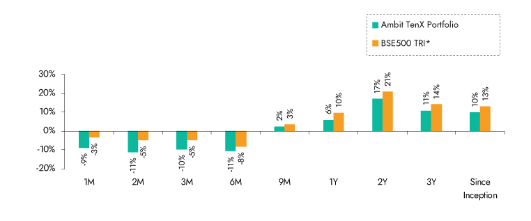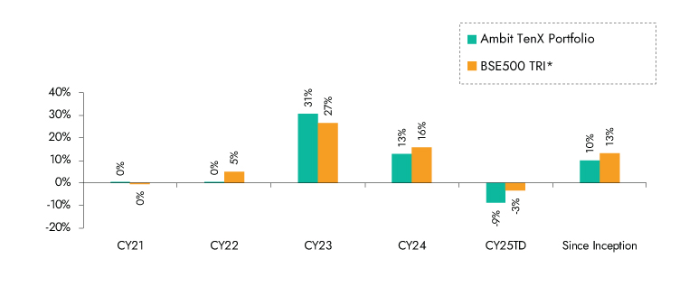 Ambit TenX Portfolio inception date is Dec 13, 2021; *BSE 500 TRI is the selected benchmark for the Ambit TenX Portfolio. The same is reported to SEBI.