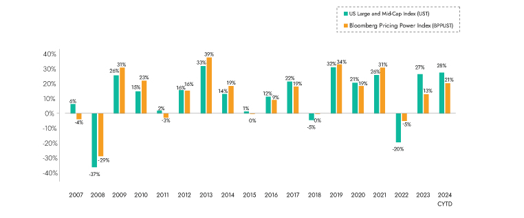 Annual performance of the bloomberg pricing power index (BBPUST) versus the bloomberg US large and mid-cap index (UST)
