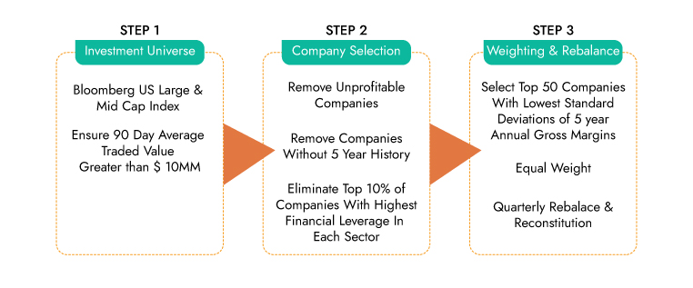 The Bloomberg Pricing Power Index identifies “pricing power” as the long-term stability of gross profit margins. It follows a simple three steps: 1) Identifying an investment universe, 2) company selection and 3) Selecting Top 50 companies with lowest standard deviation. Bloomberg has the following equal weighted 50 stock Index based on its pricing power methodology across global markets: 1.) Bloomberg US Large and Mid-Cap Index or US Index, 2.) Bloomberg European Developed Markets Large and Mid-Cap Index or EDM Index, 3.) Bloomberg APAC Developed Markets Large and Mid-Cap Index or APACD Index, 4.) Bloomberg Emerging Markets ex-China Large and Mid-Cap Index or EMXCN Index.