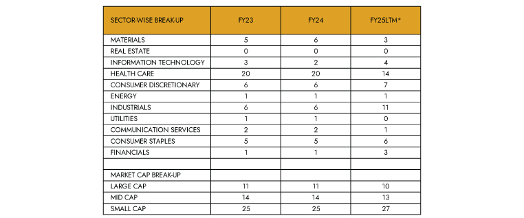 - Majority of the companies in the Top 50, even in the Indian context, are from the healthcare and industrial sectors (FY25 LTM – 14 healthcare stocks and 11 industrials stocks). The market cap wise breakup for FY25 LTM stood at 10 stocks from large cap, 13 stocks