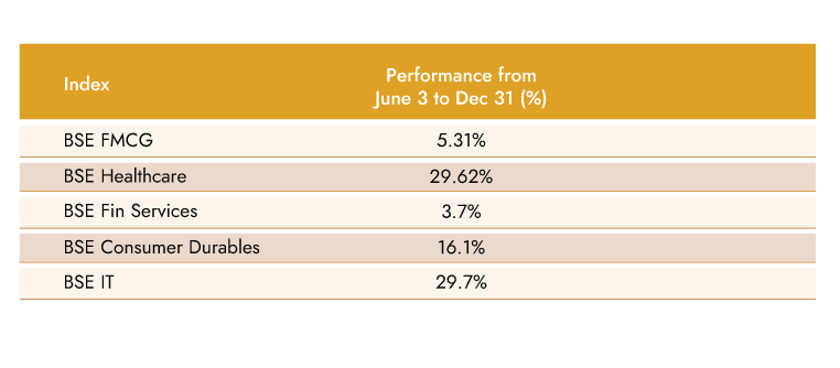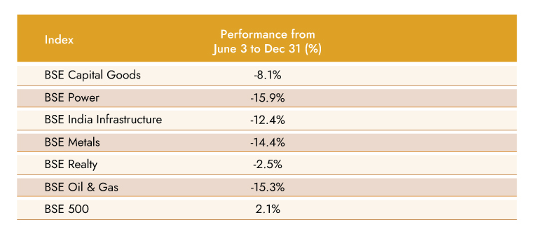 There is a noticeable change in the sector allocation post the results of the Union elections on 4th June 2024 until 31st December’24. Sectors with good return ratio, strong balance sheet and consistent earnings growth delivery started seeing more interest. Moreover, cyclical stocks which were more narrative based and which did well during FY22-24 saw significant draw-downs as BJP Government did not get enough seats to form Government by itself. The draw-downs were led by socialist behavior taking precedence over capex given several state elections at stake This change in sector allocation helped Ambit funds outperform broader markets given our style of fundamental investing.