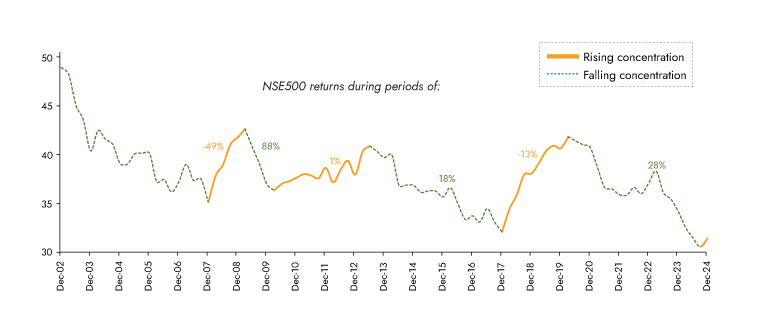 FY22 -24 was a notable aberration in the market landscape, characterized by strong performances from several companies. However, these gains were largely driven by thematic trends, occurring during a time when market concentration was on the decline. Typically, falling market concentration signals a broad-based rally, indicating a shift toward more inclusive growth across various sectors. Moreover, if we look at some of the top