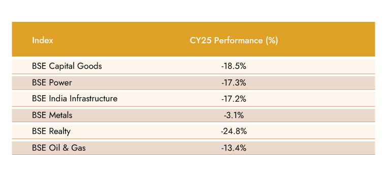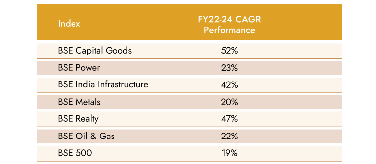 With an intention to re-ignite animal spirits post-COVID-19 outbreak in FY20, the government announced aggressive capex spends. We note that central government capex outlay saw 24% CAGR during FY21 -25 vs. 7.3% CAGR over the last 4 years preceding this period. A host of sub-segments like Capital Goods, Power, Infrastructure, Iron & Steel, Realty, and Crude Oil saw investor interest in the hope that these sectors will see re-rating on fundamentals (more narrative at that point in time than numbers).