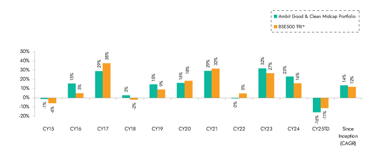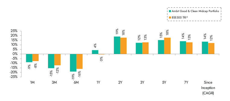 Ambit Good & Clean Mid cap Portfolio inception date is Mar 12, 2015; *BSE 500 50 TRI is the selected benchmark for the Ambit Good & Clean Mid cap. The same is reported to SEBI.