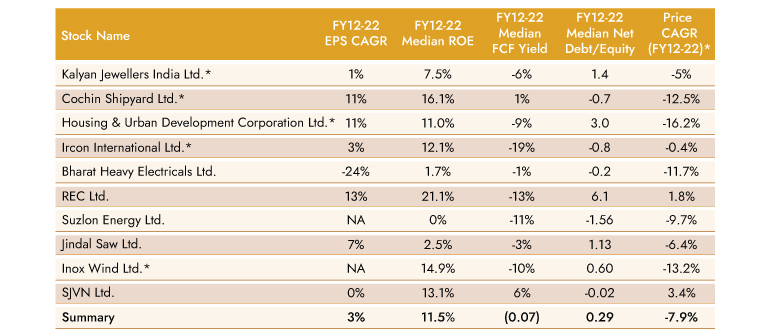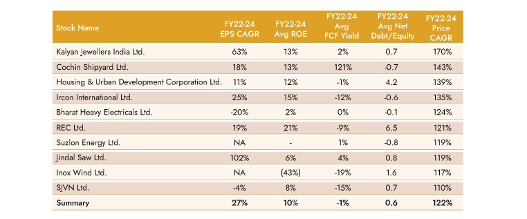 performers within BSE 500 over FY22 -24, we note mediocre return ratios and negative FCF yields; importantly, these names have not made much in the last 10 years prior to FY22 given mediocre EPS CAGR, ROE, FCF yield and leveraged balance sheet.
