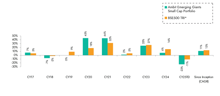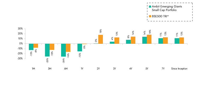 Source: Ambit Emerging Giants Small cap Portfolio inception date is Dec 1, 2017; *BSE 500 TRI is the selected benchmark for the Ambit Emerging Giants Small cap. The same is reported to SEBI.