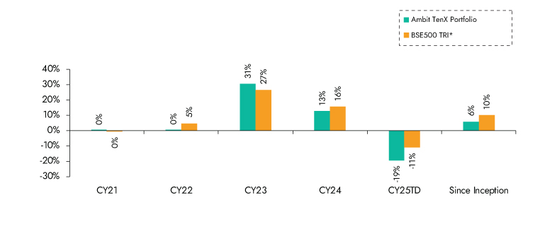 Ambit TenX Portfolio inception date is Dec 13, 2021; *BSE 500 TRI is the selected benchmark for the Ambit TenX Portfolio. The same is reported to SEBI.