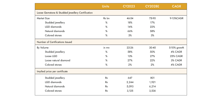 The certificates issued by volume stand at around 22-26mn and are expected to grow at a 5-10% CAGR over CY23-28, as per Redseer. In the same period, certification penetration is expected to rise from 65-70% in CY23 to 75-80% in CY28, according to Redseer, with the share of LGDs rising from 13% to 27%, growing at a 25% CAGR. Certification penetration in LGDs was 70% as of CY23, higher than naturals at 65%, as LGDs are produced in higher carat sizes and hence are more commonly certified. The certification of diamonds is part of the midstream or downstream stage.