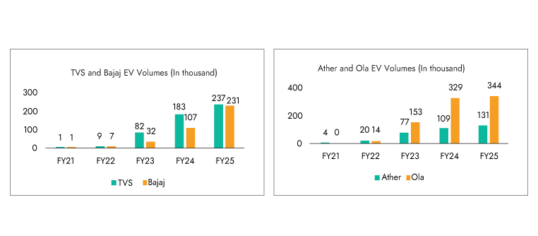 - TVS launched the i-Qube in January 2020, which has emerged as a game changer for the segment. Backed by continuous feature upgrades, varied battery pack options, and robust distribution expansion, the company achieved strong volume growth without compromising profitability. The key growth driver is the distribution enhancement the company has undertaken from 33 touchpoints in FY22 to ~900 touchpoints in FY25, driving accessibility and sales. The co. saw a market share growth from 2.1% in FY21 to 23% in Q4 FY25, making TVS the market leader in the e-2W segment.