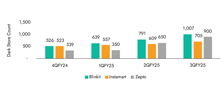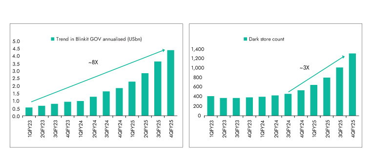 Improving unit economics is at the heart of this sustainability story. Platforms like Blinkit have scaled from 385 dark stores in FY23 to 1301 in FY25, streamlined assortments to favor high-margin SKUs, and enhanced delivery efficiencies. Additionally, cost structures have improved through reduced discounts, hyperlocal logistics, and better order density. Strategic synergies with parent platforms (e.g., Zomato) further reduce customer acquisition costs, reinforcing the positive trajectory of QC economics and enabling a long runway for profitable growth.