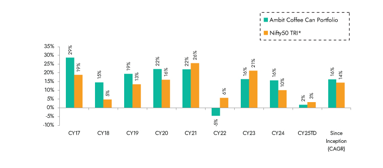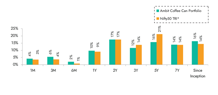 Ambit Coffee Can Portfolio inception date is Mar 06, 2017; *Nifty 50 TRI is the selected benchmark for the Ambit Coffee Can Portfolio. The same is reported to SEBI.
