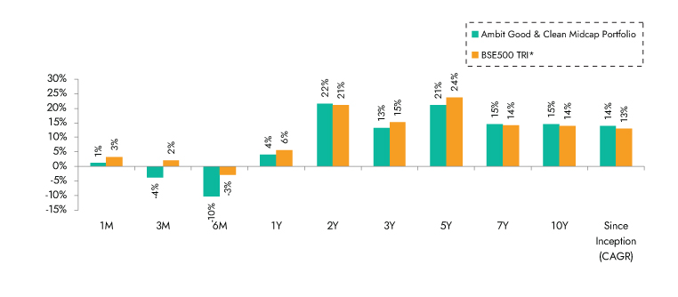 Source: Ambit Good & Clean Mid cap Portfolio inception date is Mar 12, 2015**1M Return: 1st - 30th Ap'25; 3M Return: 1st Feb'25 – 30th Apr'25; 6M Return: 1st Nov'24 – 30th Apr'25; 1Y Return: 1st May'24 – 30th Apr'25 *BSE 500 TRI is the selected benchmark for the Ambit Good & Clean Mid cap. The same is reported to SEBI.